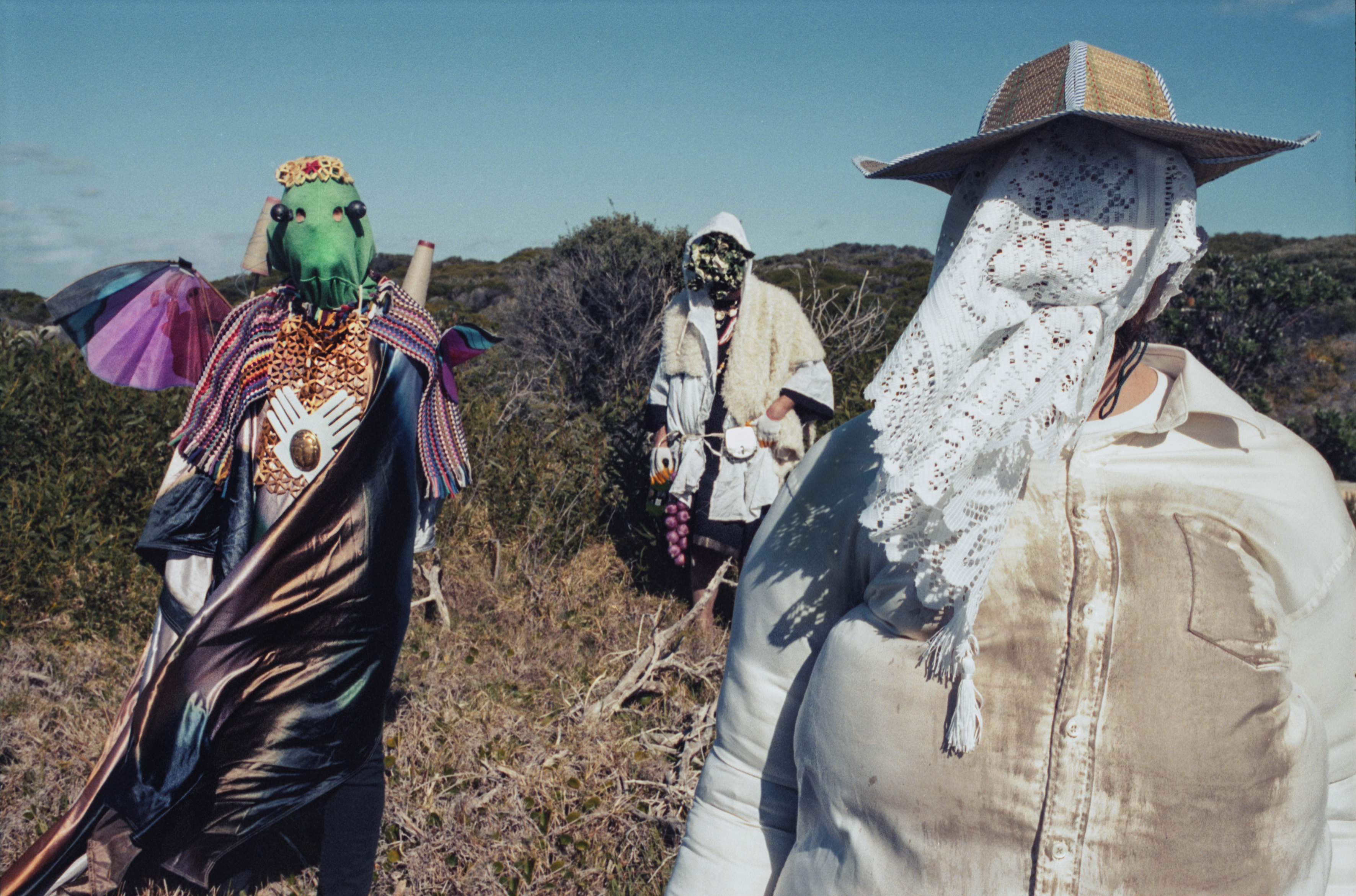 Look at these guys. This can't be a band surely? It looks like the cloth-headed kid from Spanish horror flick The Orphanage decided to restyle Klaxons and pull them out of their tragic new raver-in-a-dumpster garb by pillaging his grandma's linen closet, but by the time he got to the green-faced guy he'd given up. Nice try I guess. Sonically Mysteries new song, "Authenticity Machine," is moodily obtuse: drum sticks clatter, doomy synths rumble—almost on a trip-hop tip—while the singer's langurously paced, velvety tones contain the warmth and depth of Elbow's Guy Garvey. Which is always a good thing. Meanwhile the chorus would be totally perfect for the soundtrack to the scene in a horror film (I've got scary on my mind) where the young virgin stumbles through the woods trying to escape that cult by the lake only to come across a clearing, and a bonfire, and these three dressed like this doing some freaky-ass ritual involving a goat and some spider legs. And guess what SHE'S THE INGREDIENT FOR THE SACRIFICE.