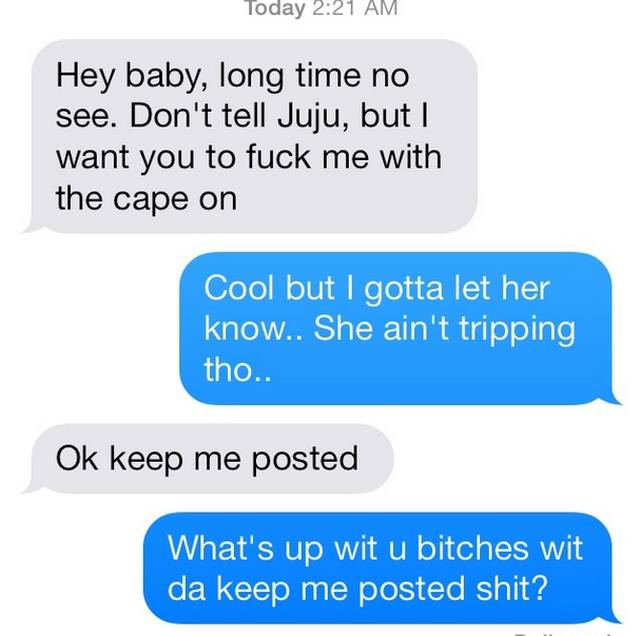 If you're in a loving relationship and you receive a text like this, your first thought may be to not tell your partner. Maybe you're trying to cheat and don't want to get caught; maybe you just don't want to start a fight. Either way, your instincts are wrong. Cam recognizes that the only route in this situation is honesty. He's not about to go behind Juju's back, and that's incredibly dope. Like, how many of you would really tell your significant other if you got this text? Honesty is the key to any successful relationship, and that may be the most vital piece of information ever. Don't lie.Brian Padilla writes like the plant in Little Shop of Horrors, except instead of "feed me Seymour" he's like "read me, Dame, read me Lyor." He's on Twitter - @NYCbros--Need more Insta-ration? Check these out:King Shit: Tyga's Instagram Is the Most Inspiring Place on the InternetChingy's Instagram Account Is the Resource You Need to #StayWokeThe One Person Young Thug Follows on Instagram Tried to Fly Me to Dubai in Exchange for SexThe Greatest and Best Blunts on Instagram