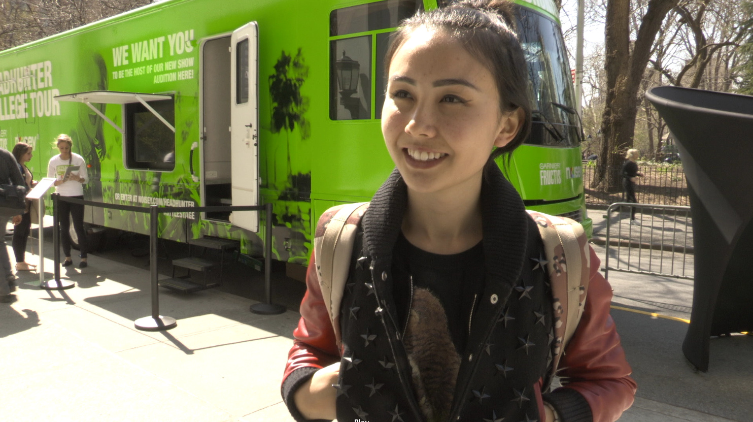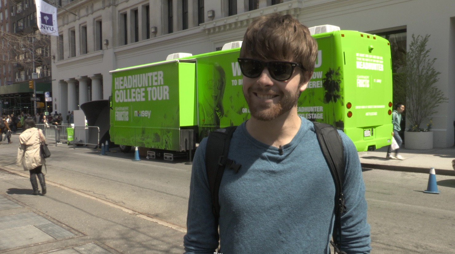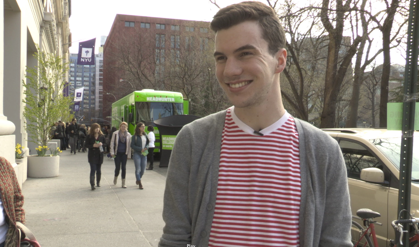 After Miami and Tampa we took our search for two Headhunter hosts to New York City, parking the tour bus at edge of Washington Square Park, just outside NYU. Touring is tiring, but what’s harder is trying to find two hosts that really know their stuff when it comes to music and style, not mention the ability to communicate all this on camera. We’ll be sending a guy and a girl on the road this summer to talk to festival goers about music, hair, and style, and that basically means the hosts have to be natural, knowledgeable, and charming. Essentially, they have to be an obscenely awesome couple of people. Luckily, once we arrived the bus was swamped applicants.