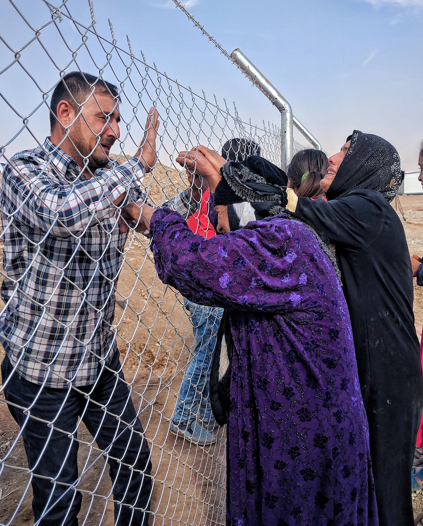 A young girl sees her brother for the first time in nearly three years. He managed to flee the village of Tobzawa before ISIS blocked the route out. His sister is now at the Al-Khazer camp for the internally displaced.