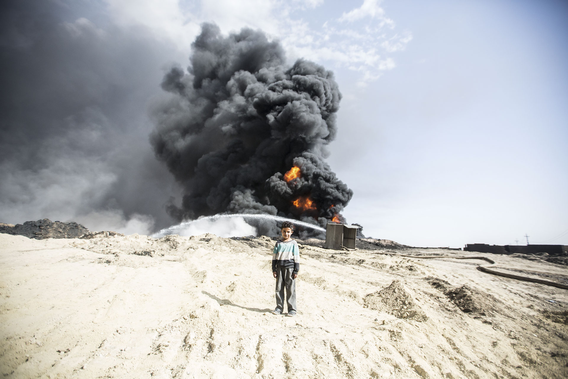 A young child plays around the oil fires of Qayyarah. Life continues now that IS has left the town, but many suffer from constant coughing and vomiting, with their hands and feet permanently covered in black, oily soot.Hind Hassan has been at the camps and villages near Mosul, where the internally displaced seek safety: