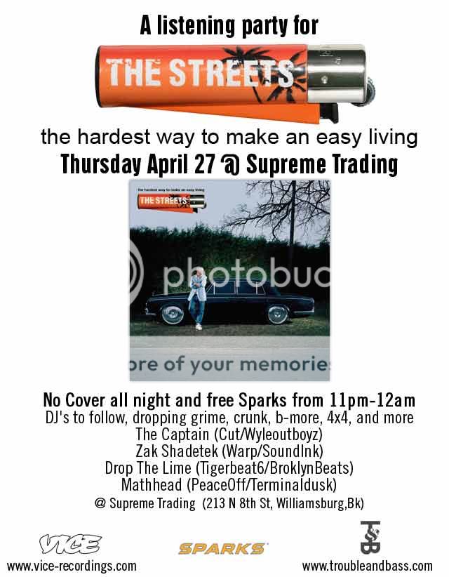 Brooklyn Listening Party Info: Sneak a listen to The Streets - The Hardest Way to Make an Easy Living this Thursday, 4/27 with drinks, drama and Trouble & Bass DJ triple tag team set: Zak Shadetek (warp/sound-ink) + Drop The Lime (broklynbeats/tigerbeat6) + Mathhead (reducedphat/terminal dusk) & Dirty Down/Cut Crew's - The Captain.