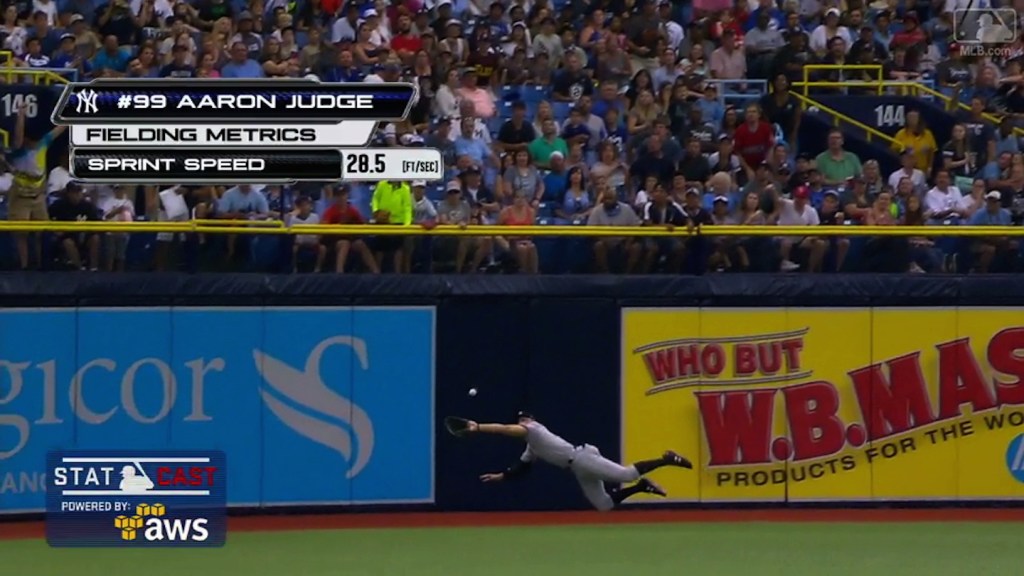 Yankees right fielder Aaron Judge has become a household name thanks to his size (prodigious) and power (somehow prodigious-er) as he’s jumped out to an MLB-leading 15 home runs so far this season. With home runs of 460, 457, and 451 feet this season, Judge’s name is littered across ESPN’s home run tracker. But here’s the thing, Judge can make some plays out in the field, too.