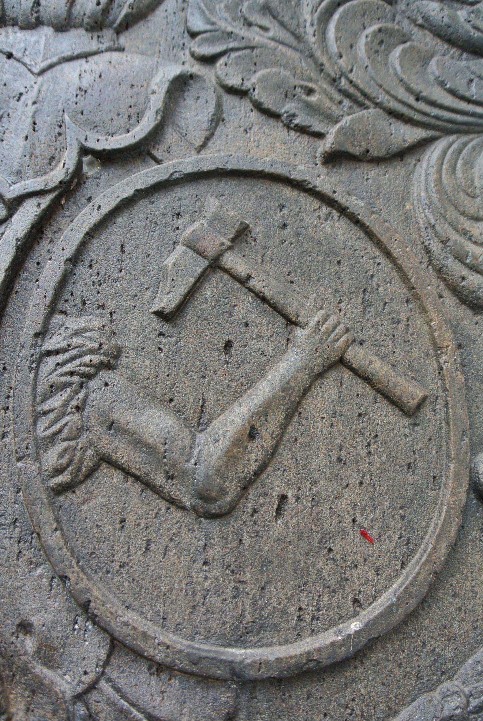 At the entrance, I found a relief carving of an arm holding a gavel—a symbol that means the the authority of the freemason grand masters have control of the lodge.