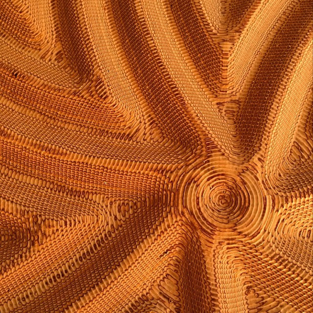 “I’m interested in using this technology to express art through form, texture and spatial experience,” Anderson told Instagram. The process itself is reminiscent of early, subtractive versions of 3D printing, which carved desired objects out of blocks of wood. Often naming his works after phonetic representations of the phenomena they represent (e.g. /ˈspīrəl/, /ˈärˌɡīl/, and /rəˌvərbəˈrāSH(ə)n/), Anderson’s eye for finding patterns within the wood yields consistently mesmerizing results.