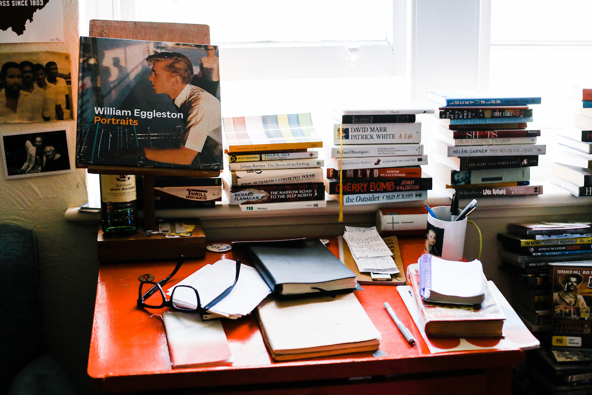 “My little red desk. Bought off the lovely Margaret, and a constant companion. There are bite marks on all four edges. It’s been that kinda year.”