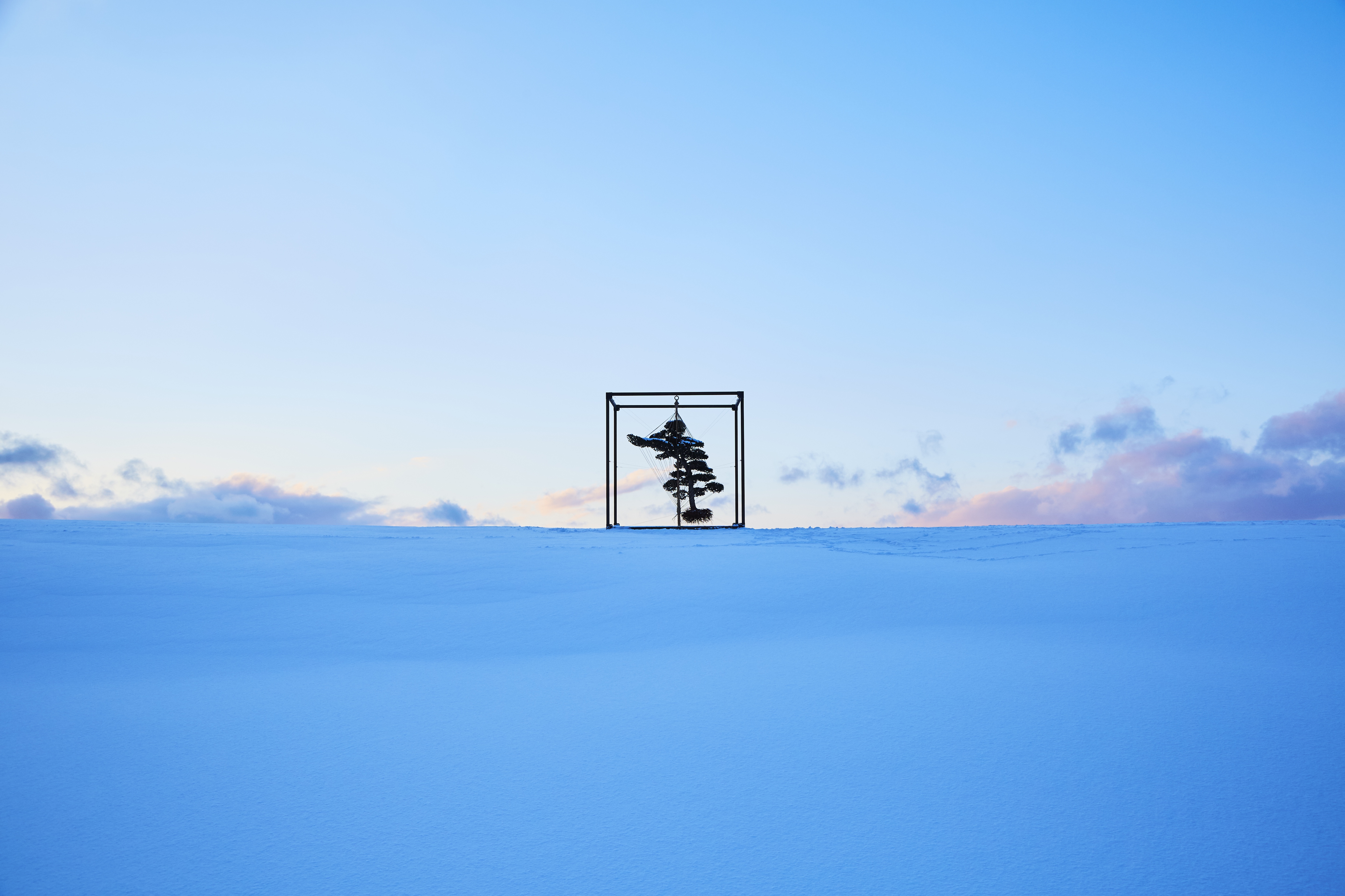 For his latest collaboration with photographer Shiinoki Shunsuke, Makoto adds a five-meter-tall behemoth bonsai to the series on a snowy Asahikawa hilltop, the second-largest city on Japan’s Hokkaido island. A metal frame and a web of rope and wire support the tree as it hangs in contrast to the serene winter scene, creating what Makoto calls, “a new stage of beauty.”