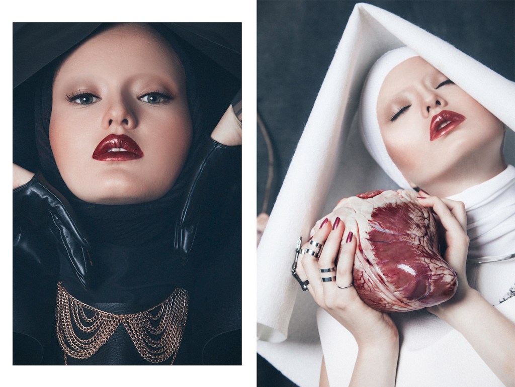 Once outside the Church, she began to experimenting with different artforms. Then she found photography. “It became my surreal place,” Cuartas explains. “A place to create stories without limit, where everything can happen.” Photography helped refocus her life around the parts of herself she had neglected, all of which surface in her series,Peccato Carnale (Italian for “Sin of the Flesh”), where nuns dressed in black and white don heavy mascara and lacquered red lipstick while holding handfuls of meat or their own breasts.