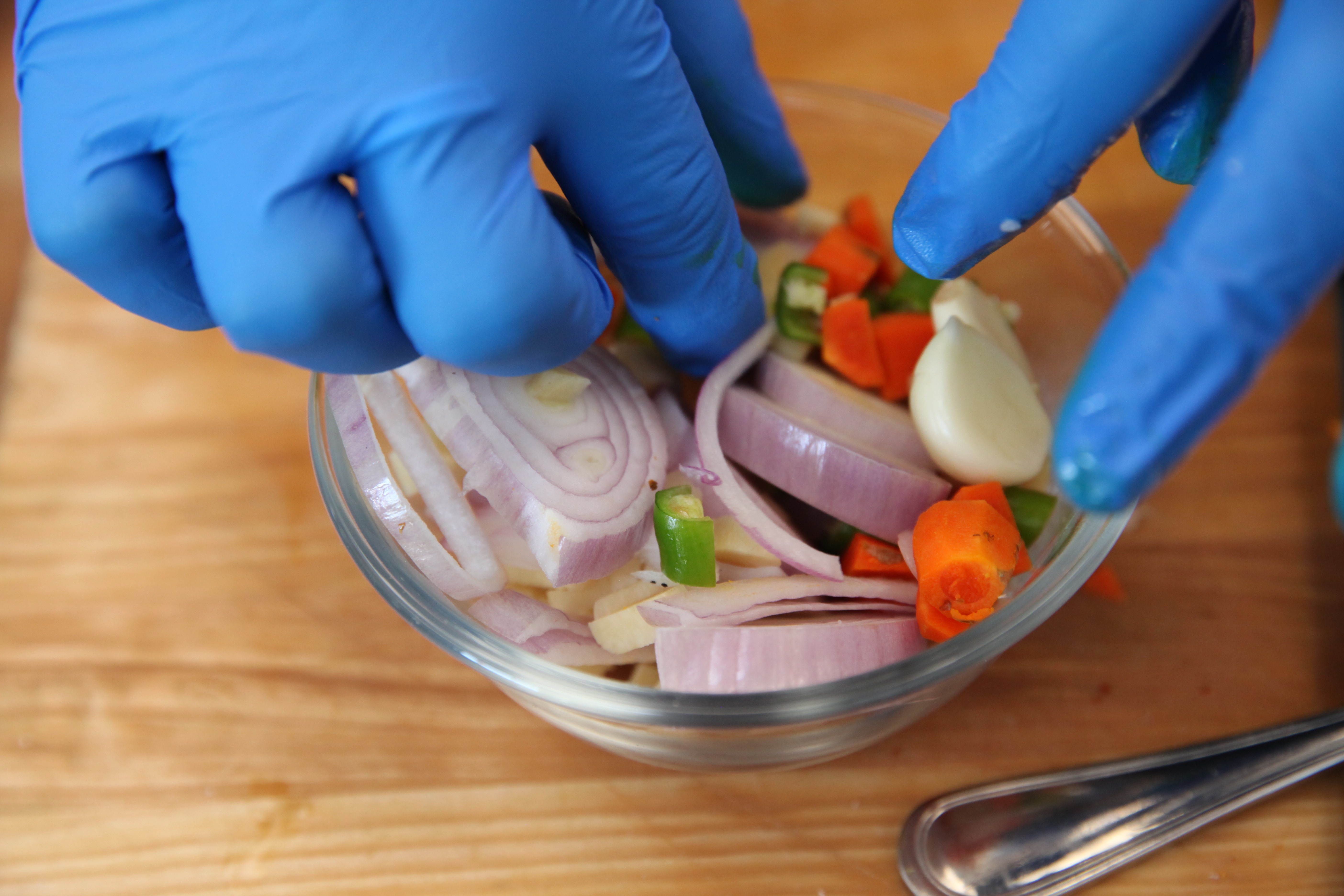 Next she makes her curry paste. Into our giant molcajete goes ginger, fresh turmeric, coriander, garlic, shallots, Serrano chili, and a bit of cayenne pepper. She pounds away until it’s consistent and well combined but not perfectly smooth. “You could use a food processor, but this is more fun,” she says. (You might want to add a bit of water to help your food processor along if you do, she notes.) She also suggests wearing some latex gloves if you’re not fond of having turmeric turn your fingers yellow for the rest of the day.