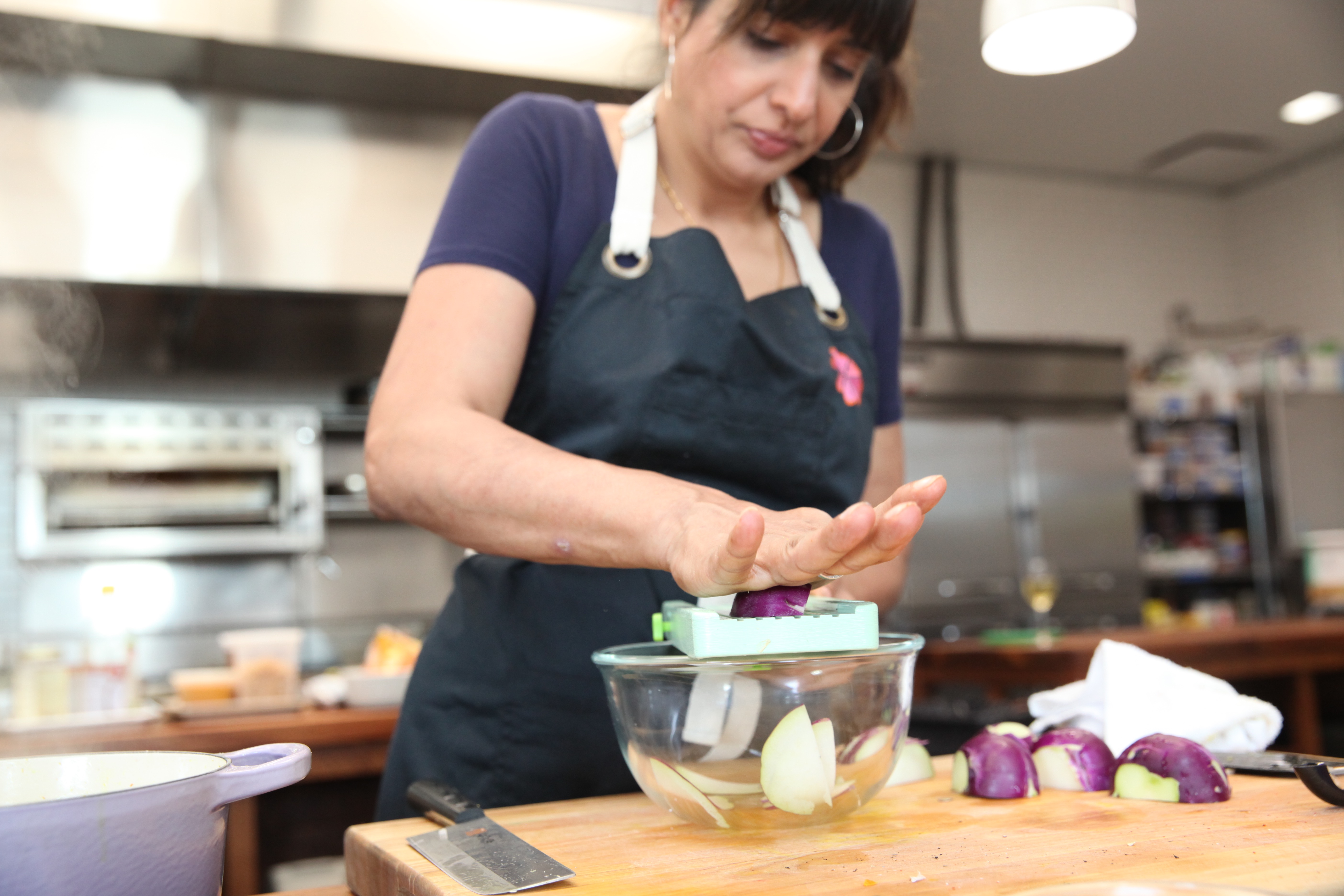 Next, she moves over to our gas range, instead of the electric induction burner the curry’s been simmering on, to make a tarka. (Nothing quite like big flames to make sure you’re getting your spices thoroughly toasted, she explains.) Into hot oil, she tosses whole mustard seeds, which start popping like teeny, tiny popcorn almost immediately. Then shallot, more curry leaves, and chilies go in next, all spitting at her like earlier, and everyone flinches away except for her. Nerves of steel on this chef, it seems. The tarka pan gets deglazed with a bit of the nearly-finished curry, then the whole mixture gets added back to the curry pot.