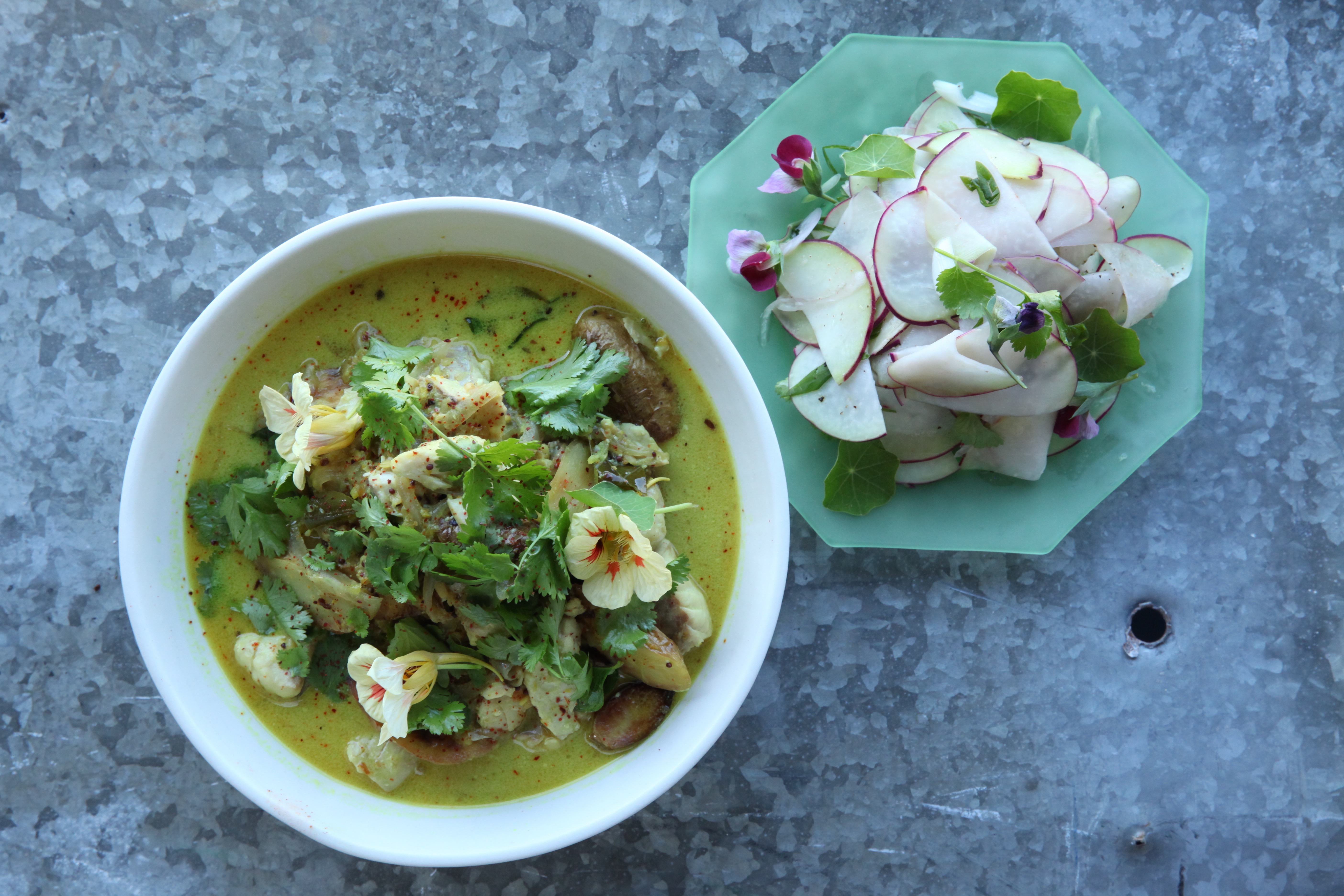 When the curry has finally finished simmering and once been all plated up with nasturtium flowers and cilantro leaves, we are blessedly allowed to dive in. Cheetie is embarrassed she didn’t also cook some basmati rice to serve this over, but for those of us in the kitchen who have watched this whole thing come together, we’re too hungry to wait for any more water to boil, let alone steam rice. (You should do that at home, though, for sure.) We’re unabashedly going at it with spoons, ladling fluffy chunks of snapper into our mouths and finishing the bite with a crunchy, lemony kohlrabi pickle slice for a composed bite that feels too perfect to have come together in less than 45 minutes.