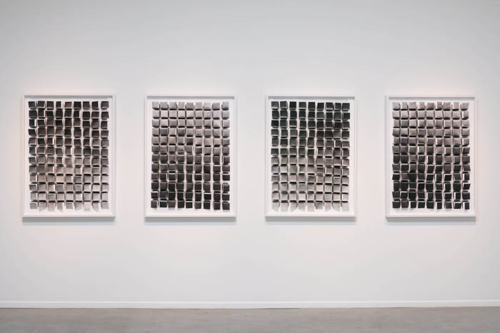 In Partition 46, a web of open cubes grow darker and darker in the center of the composition, like a deep vortex ready to absorb the viewer. The sharp angles of Partition 44 seem to swirl around on the surface, while Partition 42 resembles a crowded architectural model, like a bird’s eye view of an impossibly dense suburban landscape.
