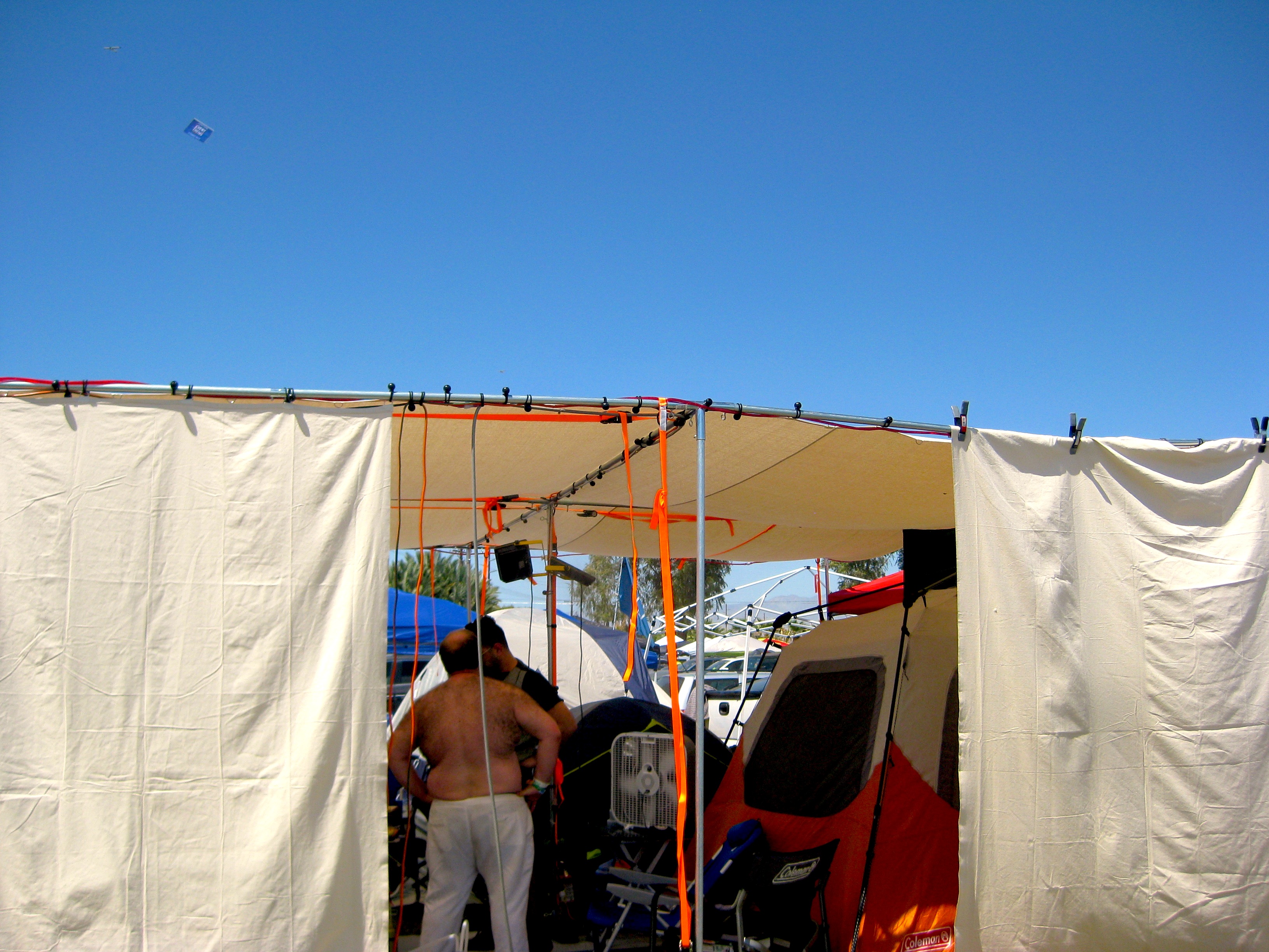 We’ve made a 20-by-20 shade structure with tubing and canvas. My girlfriend sewed together the canvas and I did the welding. I fitted the structure with a misting rig to keep the place cool. We’ve also got air conditioning running from a car battery through this bucket. There’s a grill over there, too. And we’ve got a shower. Would you like something to drink, a margarita?