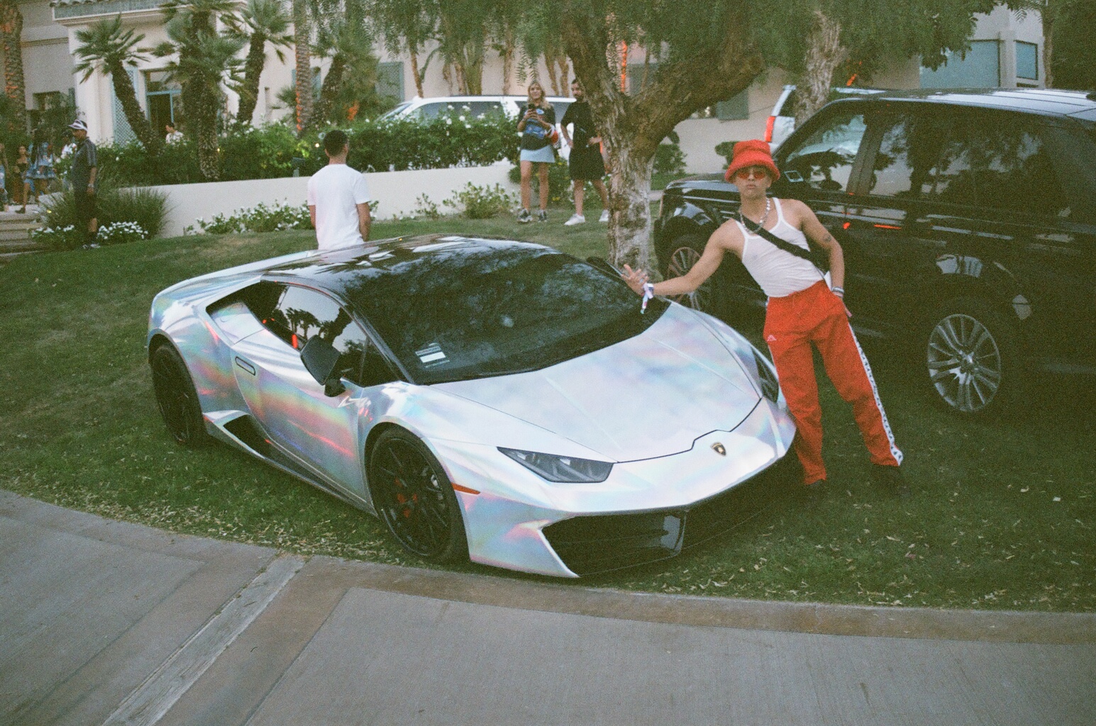 As the shuttle pulled up to the drop off, we were held hostage on the bus waiting for security clearance to disembark as an exodus of partygoers were impatiently trying to bounce out and hop to their next location. Claustrophobia hit, and I started to have PTSD from The Weeknd’s 27th birthday party. After 15 minutes of everyone on the bus having an anxiety attack ready to shatter the windows, we were finally let off. I breathed a sigh of relief, and ran through the line of neon-lit palm trees and Keith Haring-esque rainbow print BMWs like Moses parting the seas, stopping onto the grassy dancefloor flanked between a lagoon and the mainstage where Travis was performing with Diplo, Pedro, and their entourages. Allofasudden, two helicopters started circling over the dancefloor shining their searchlights down on the party crowd, causing everyone to be in a dusty, confused haze… were they actually looking for someone, or was this all a stunt orchestrated by mastermind momager Kris Jenner? For a moment, I thought I was an Instagram model who’d called in a SWAT team to evacuate me from Ja Rule’s Fyre Fest.