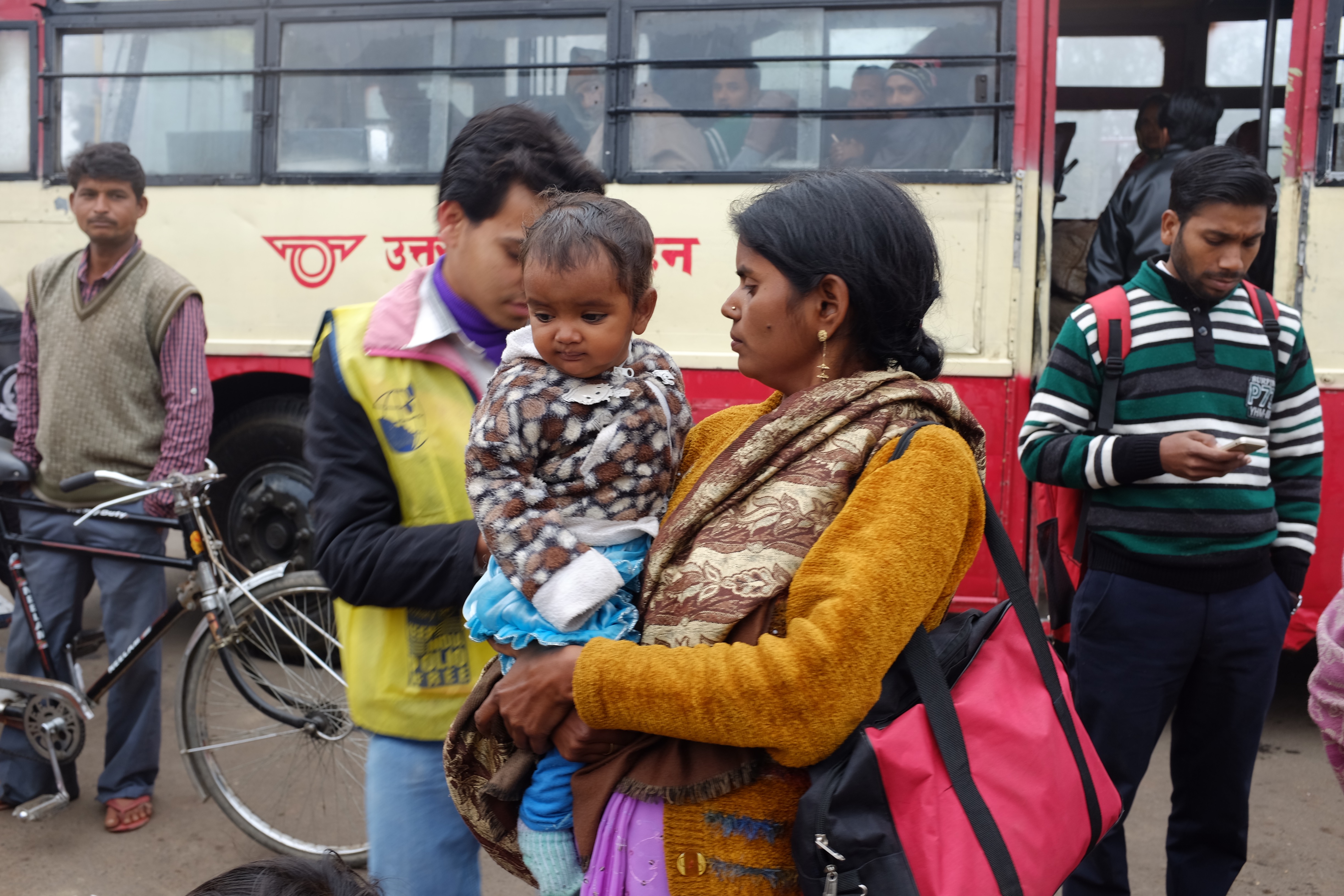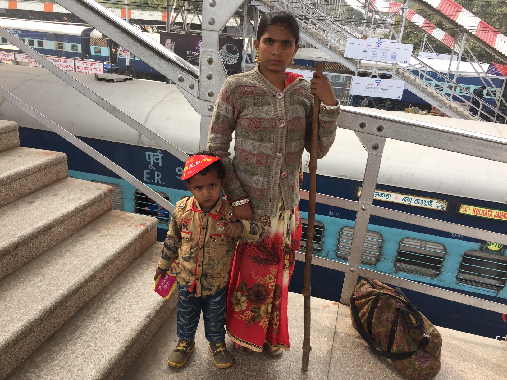 Veera, a woman who has polio, with her child Mayank, who was just vaccinated by volunteers at the train station in Bareilly. Image: Ankita Rao