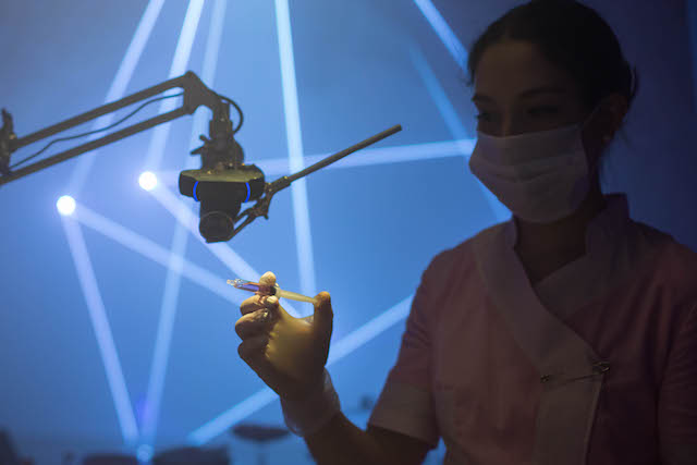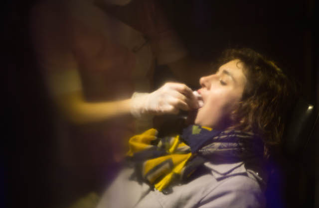If you ever wondered what your own face chewing a marshmallow might look like if it was converted into a sonic laser light show, then the new installation from Marshmallow Laser Feast (MLF), the creators of Laser Forest, should help you tick that off the bucket list. Part of the Convergence festival in London, Laser Face sees visitors filling out a form to decide what flavored marshmallow they want to chew, and electing whether or not they want a syringe full of vodka to wash it down, and then placing themselves in a dentist's chair inside a booth cordoned off with plastic sheets. An operator gives you your marshmallow of choice, and as you chew, your facial movements—tracked on a webcam, piped through OSC, and converted and translated into points in space—are sculpted in real-time into a kind of projected laser mask which can be changed into a variety of different "laser-looks."