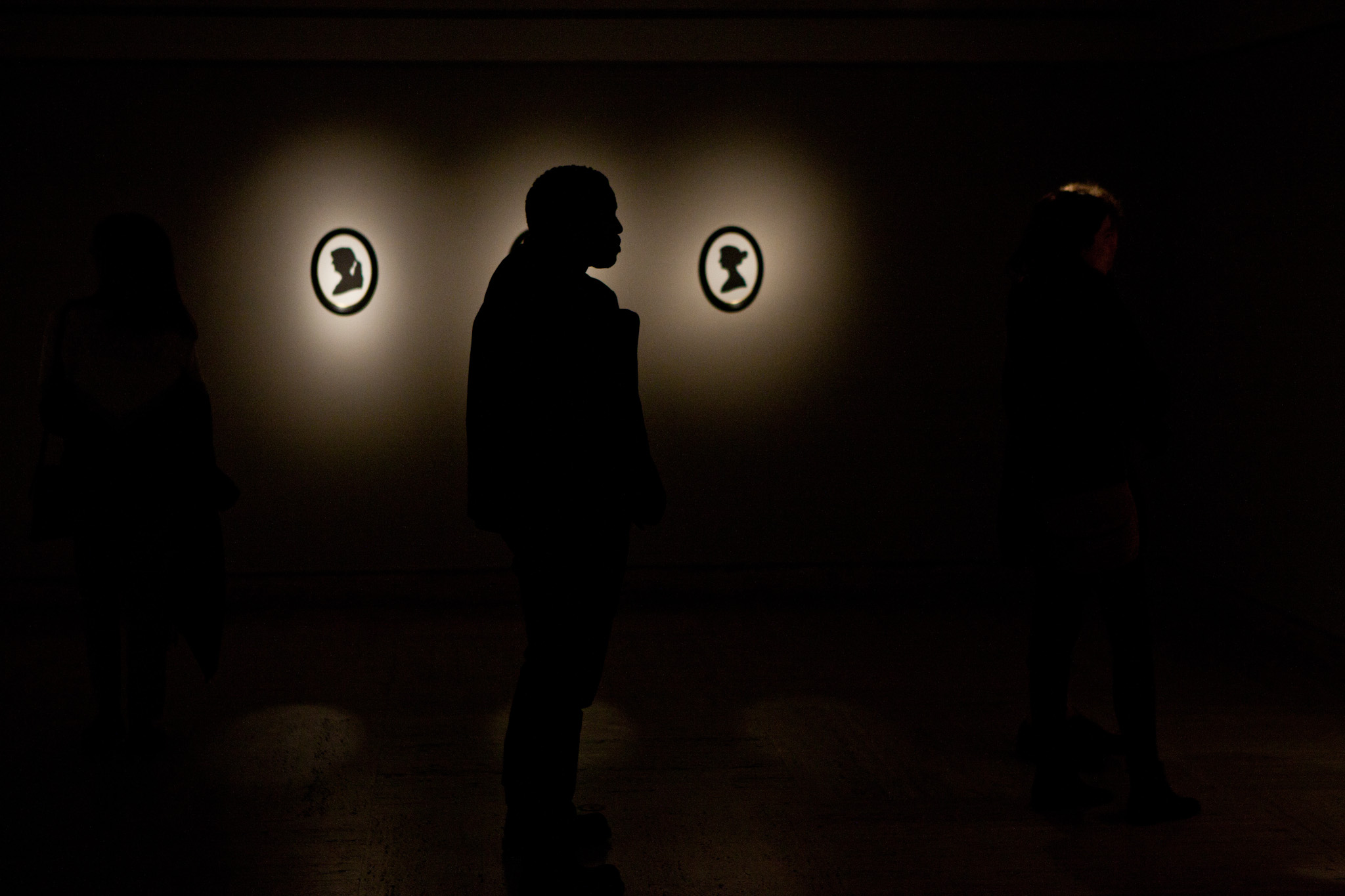 Visitor’s view “Physiognomies, Silhouette,” 2017, (cut paper) at the reception for “Middle Child”. Photo by Eric Baillies for the Chazen.