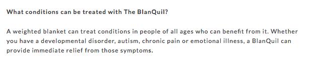 I hadn’t read BlanQuil’s website in detail before trying the blanket, but now that I was, I was alarmed at the wide variety of conditions it was claiming it could “treat” and provide “immediate” relief for.