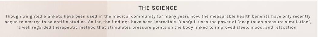 BlanQuil says that their blankets work by using deep touch pressure stimulation, “a well regarded therapeutic method that stimulates pressure points on the body.” It’s true that weighted blankets have been used for kids with autism, and in some cases with elderly dementia. BlanQuil’s cites these applications, saying: