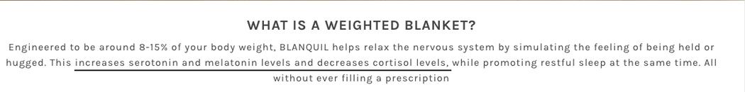 But this treatment element that bugged me is not what riled up Muskin the most about BlanQuil’s claims. What he says he found more upsetting was a sentence I had skipped over, because it was just pseudo-sciencey enough for me to take as truth. In fact, it has little merit at all. BlanQuil says on their site that their blanket can change people’s neurotransmitter levels.
