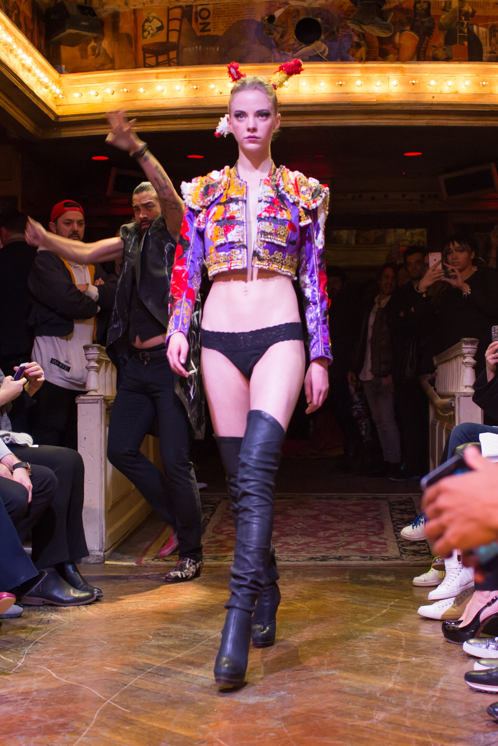 “I always loved to paint my friends’ clothes when they would come over,” Zapata tells Creators, standing in a dark bathroom of The Box, the show’s venue, immediately following its debut. Lindsay Lohan, Miss Jay Alexander of America’s Next Top Model fame, and Jeremy Carver, an actor on Empire, were in attendance. “Sometimes I would get paint on my own stuff and sometimes I don’t have time to change and I would think well that doesn’t look bad.” What that morphed into for the collection was a show composed of five vignettes showcasing everything from bullfighter jackets to cardigans, a qipao dress, and even motorcycle jackets, all hand painted by Zapata.