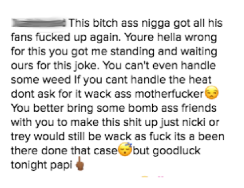 Can your boy, your daddy, dad, handle his weed? Will he ever “Light Up” with the best of them? Does Drake really stand for Do Right And Kill Everything, as he once announced on a song, but with an asterisk pertaining to never being personally involved in the killing of the blunt? Who can say, really. It’s all open to interpretation. What isn’t though is the fact Drake cancelled his show last night 45 minutes after fans had already been let into the venue. Or that fans are a little upset. Presenting exhibit A, Instagram comment, left underneath one of Drake’s most recent photos: