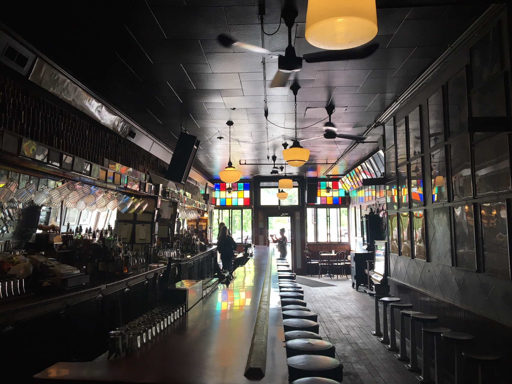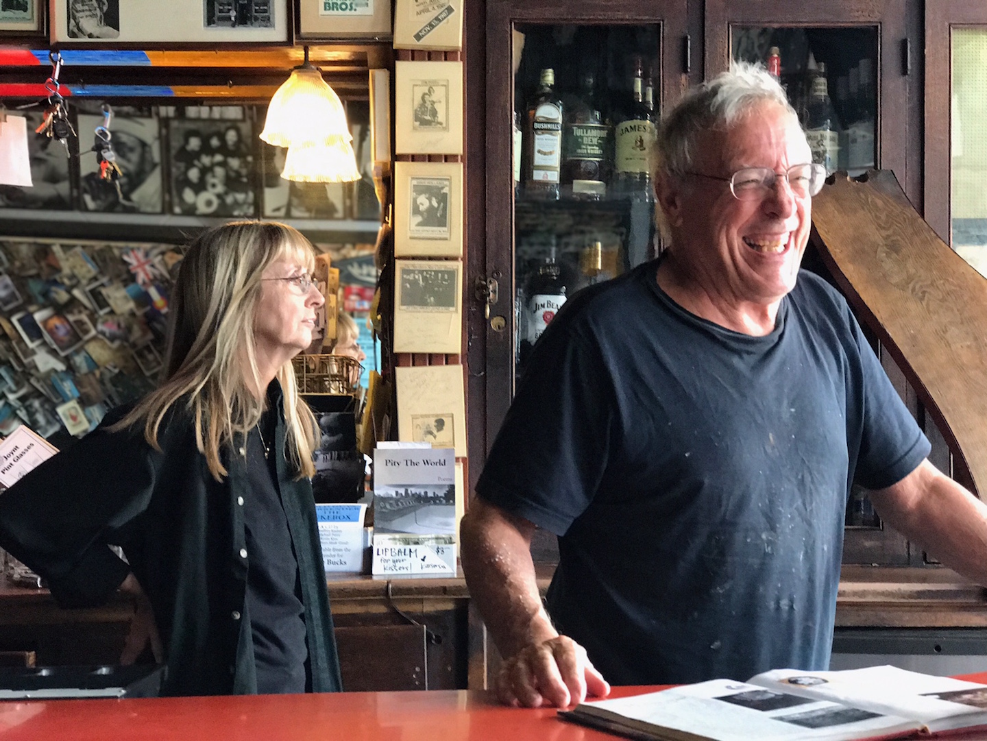 So we do. The bar is closed (it is, to be fair, 11 AM on a non-football Sunday), but a man and woman who turn out to be Nolte and his longtime partner Kathy are inside, and they let us through the door after we tell them we know Gil, because this is how small(ish) towns work. Inside, the walls are covered with bumper stickers (“THE MORAL MAJORITY IS NEITHER,” “Beware of the Dance Police!”) and a banner rightly proclaiming, “All we are saying is give cheese a chance.” Bill is a gregarious man, white-haired with sparkling eyes and streaks of paint on his faded jeans. He talks a lot with little prompting, and he looks a bit like Nick Nolte, who happens to be his second cousin.