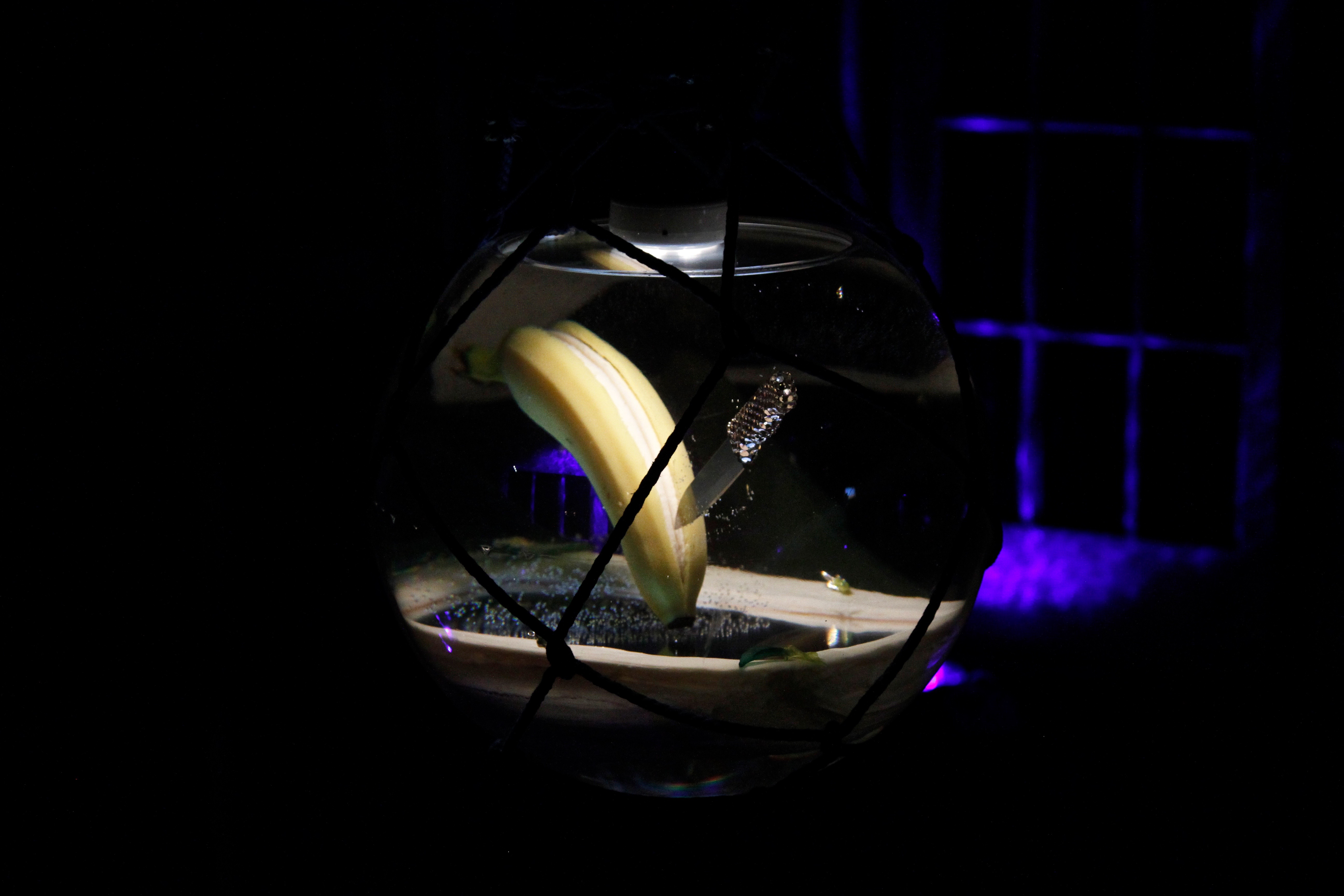 At the opening this Saturday, everyone crowded around the orb which represents my sister. People were actually waiting on line to see it and of course when my sister saw that, she was like, “Yeah, I know. I’m the best.” In her orb, there’s a knife slicing a banana down the middle. I chose those objects for two reasons. First, she’s a YouTube addict and she’ll watch every video of how to make banana bread, then go through a banana bread phase where she makes hundreds of banana breads. Secondly, she’s also a belligerent feminist and will post videos on her Instagram of her slicing bananas while saying, “Yeah, fuck dicks.” So I combined both of those things. Once I put the banana in the orb, I turned it on the side so it could be sliced by the knife. It symbolizes a lot of anger, also love.