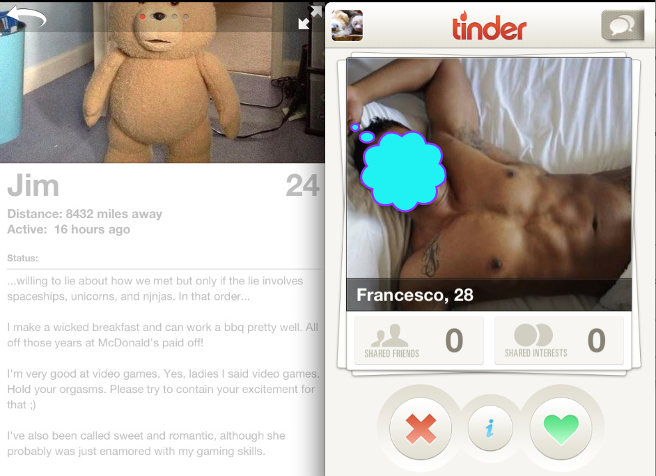 I first discovered Tinder around August. My little brother, a gifted dater of women, texted me to tell me he’d met a girl on an app. Within minutes, I was Googling it, convinced it was a salacious sex app and I must intervene before he got an STD. Within another few minutes, I joined. Because I was near West Hollywood at the time, my app immediately uncovered a treasure trove of douchebags. A sideways-cap-wearing, pectoral-flexing extravagance of douchebags, lightly seasoned with spelling mistakes and misplaced self-belief. It added up to one fun afternoon.