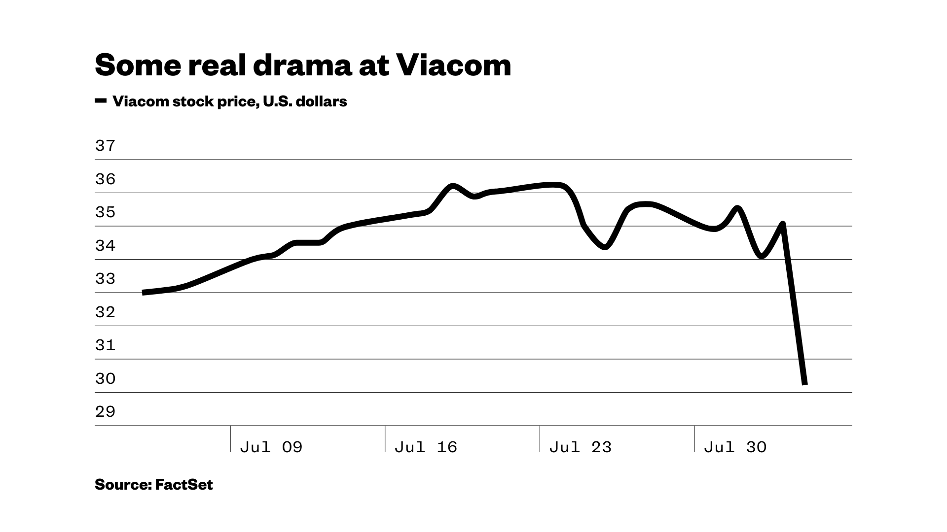 The weak outlook was part of the company’s latest quarterly profit report, which showed solid earnings for the recent period from April to June. But no matter. The glum forecast of what’s to come was enough to send Viacom shares plunging 14 percent on Friday.