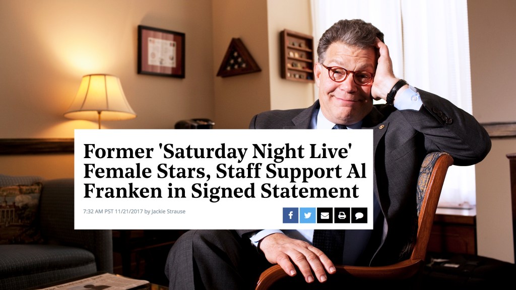 What Al did was stupid and foolish, and we think it was appropriate for him to apologize to Ms Tweeden, and to the public. In our experience, we know Al as a devoted and dedicated family man, a wonderful comedic performer, and an honorable public servant. That is why we are moved to quickly and directly affirm that after years of working with him, we would like to acknowledge that not one of us ever experienced any inappropriate behavior; and mention our sincere appreciation that he treated each of us with the utmost respect and regard.