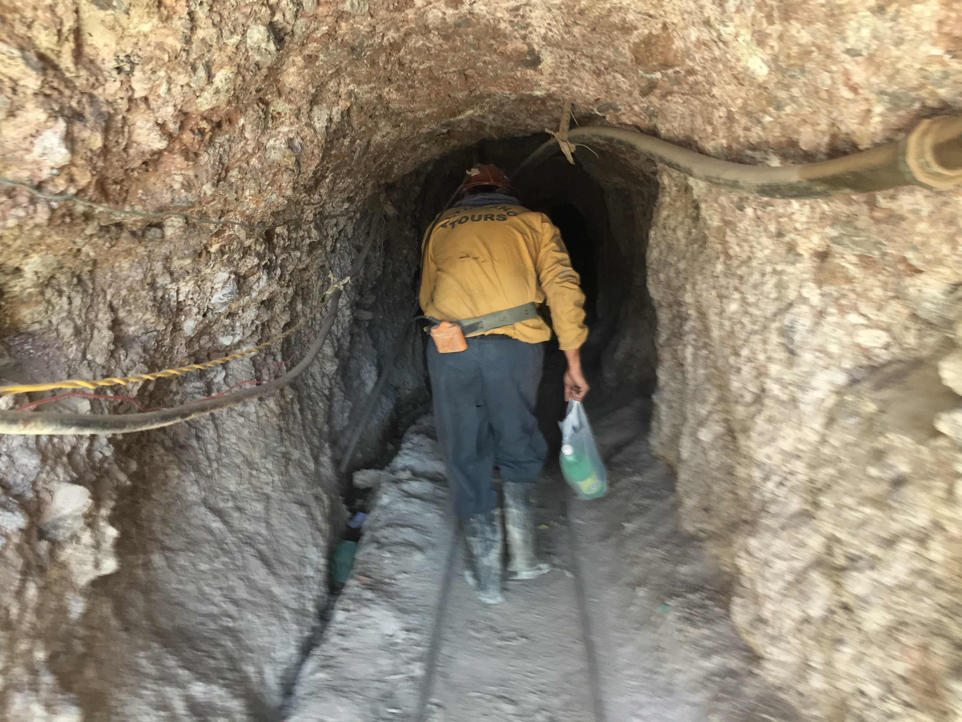 Deep in a mine shaft at Cerro Rico, Marie, Jason, and I are ducking under collapsed support beams, checking out the mineral deposits in the rock seams, shining our headlamps down forks in the tunnel that look like they might never end. It’s deep-space black down here. Jason and I are both pretty tall and lanky. For stretches, the tunnel is only four feet high, forcing us to squat and waddle. The walls close in tight, and the air feels thick. Jason starts to get anxious. So I