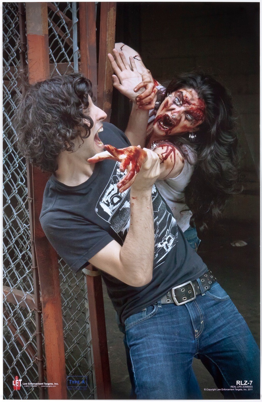 Law Enforcement Targets, Inc. of Blaine Minnesota manufactures these posters. We called them up and asked him if we could create our own series of target posters. They welcomed the chance for us to create new poster lines. At the time we were busy planning an exhibition of our work at the Aldrich Museum in Connecticut, so the first set of pictures were shot at the museum using the staff as prime players in the drama. LET accepted a selection of this first batch and marketed them as the “Workplace Violence” line. Since then, they have printed “Urban Street Violence,” “Liquor Store Armed Robbery,” “Real Life Zombies” (yes, we got to make ourselves and our friends into zombies for target practice), and now the “Mass Transit” series. We’ve done a total of 60 posters in this Trigger project, which are for sale by LET and several more will soon be in production. LET has sold over 330,000 Type A posters as of December 2012. So, people all over the country are buying our pictures, shooting at them, and hanging them up afterwards or just throwing them away.