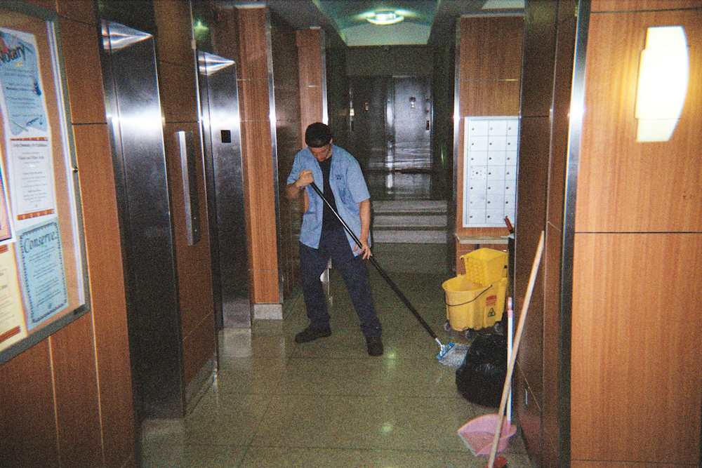 On top of snapping a few POV pics of mopping and sweeping the floors of both buildings, Ryan also captured a few exposures of him using the compactor, a mechanized pump that compacts the tenants’ trash and deposits it into ten-foot-long trash bags that resemble body bags. Here’s what else he told us about the day he spent shooting, as well as his biggest pet peeves about the tenants whose buildings he cleans.
