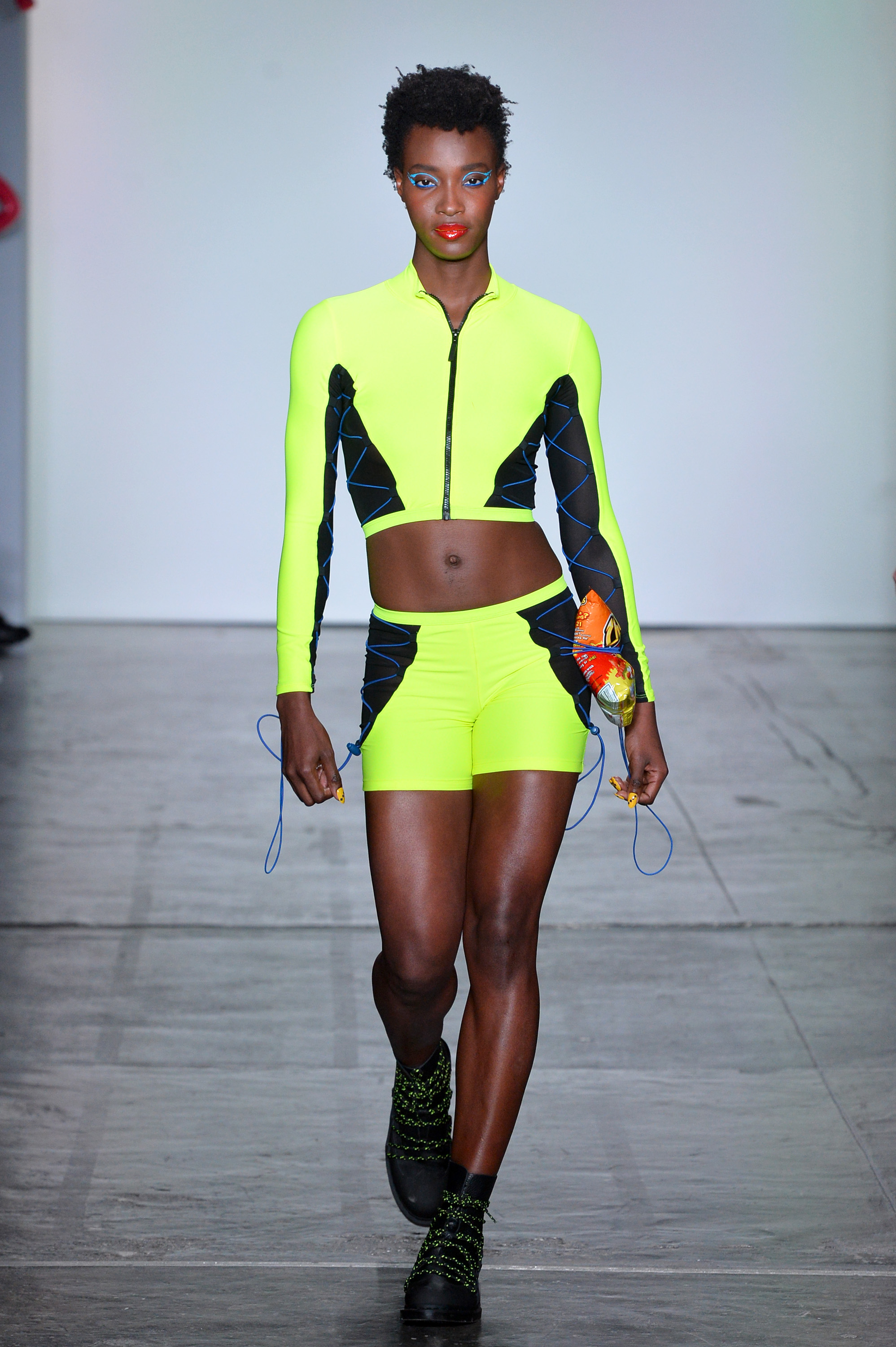 “The Chromat Autumn/Winter 2018 WAVVY collection is about trying to find joy and escape within the spiral,” Chromat’s founder, Becca McCharen-Tran, wrote MUNCHIES over email on Tuesday. “Inspired by summer kayaking trips and personal watercrafts, I imagine wearing the collection while eating Flamin’ Hot Cheetos on a boat in the Hudson. We are fitted with bungees, packing for a quick getaway.”
