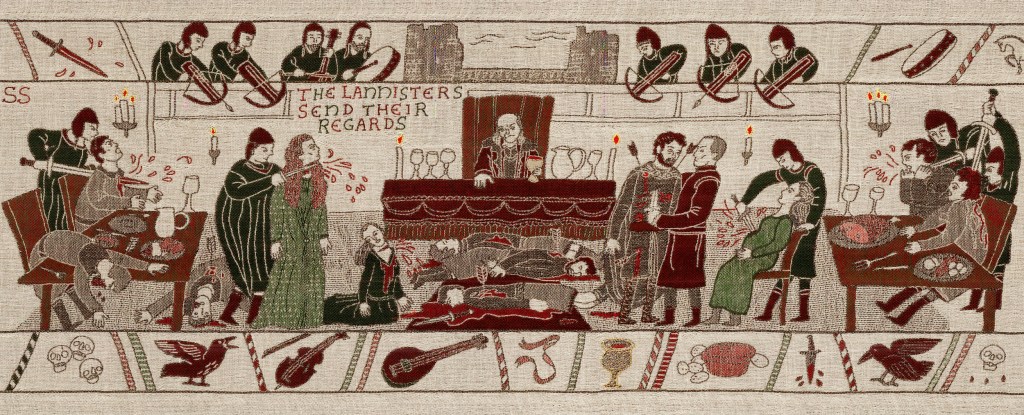 The results would look amazing hanging over the hearth at Winterfell, though the Red Wedding scenes might not go over so well. It would fit right in with Cersei’s map of enemies, though, or in the Iron Throne room. Check out stills of the tapestry below.