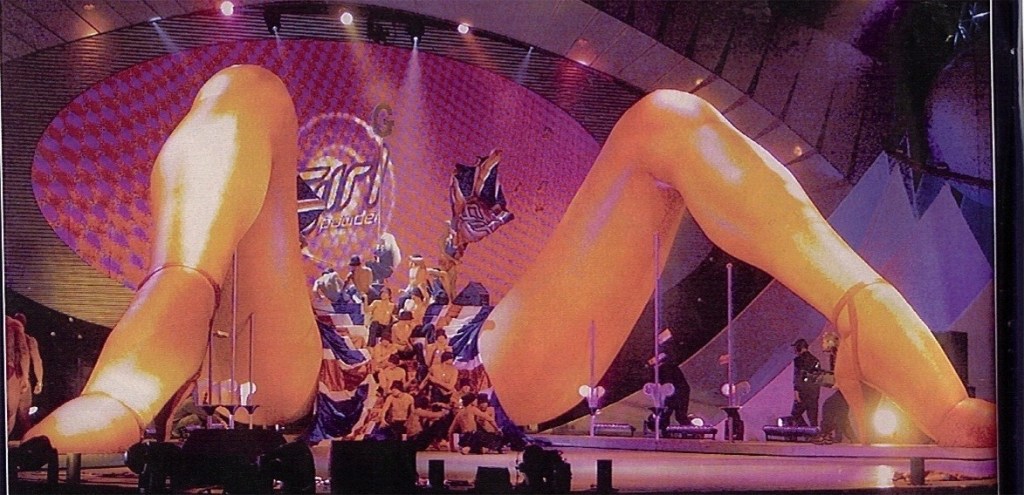 He’s what’s known in the business as a “professional inflatable sculptor“. That means that he makes gigantic inflatable props for stadium shows, and pretty much single-handedly created an industry for himself here in the UK after travelling to the US as a younger man and seeing people doing “interesting things with polythene”. Fair play. After 30 years in the business, he hasn’t just given Geri’s crotch the inflatable treatment but has been responsible for stage sets for George Michael, Lady Gaga, and others, built around gigantic inflatable tits, dogs and politicians. Seventeen years since his Geri legs piece, he talks to us from his Suffolk studio about that undeniably British moment – remember Cool Britannia? – challenging mainstream attitudes and a massive “George W Bush” getting a blowjob on stage.