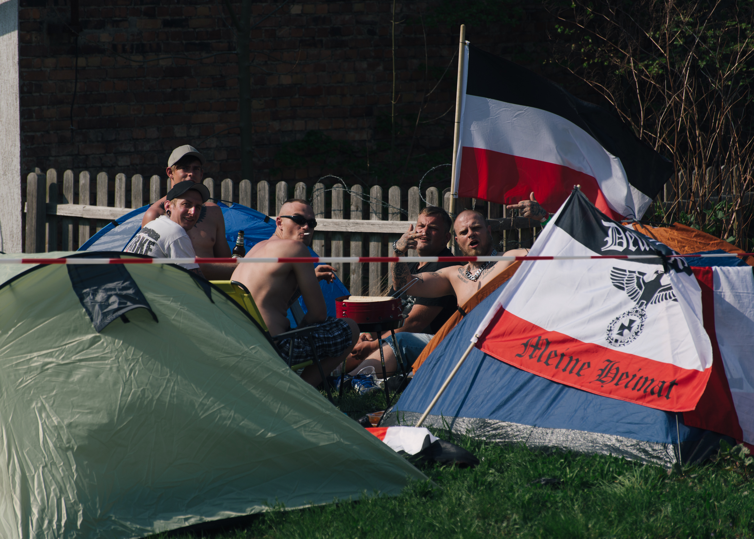 Other times they couldn’t resist crossing the line. Police in Saxony said they registered about 70 criminal charges over the weekend, the majority of them for displaying “anti-constitutional symbols.” VICE News saw one skinhead detained by the police after giving the Roman salute; on another occasion, a group taunted journalists by pointing their loudspeakers in our direction and blaring a recording of a Hitler speech.