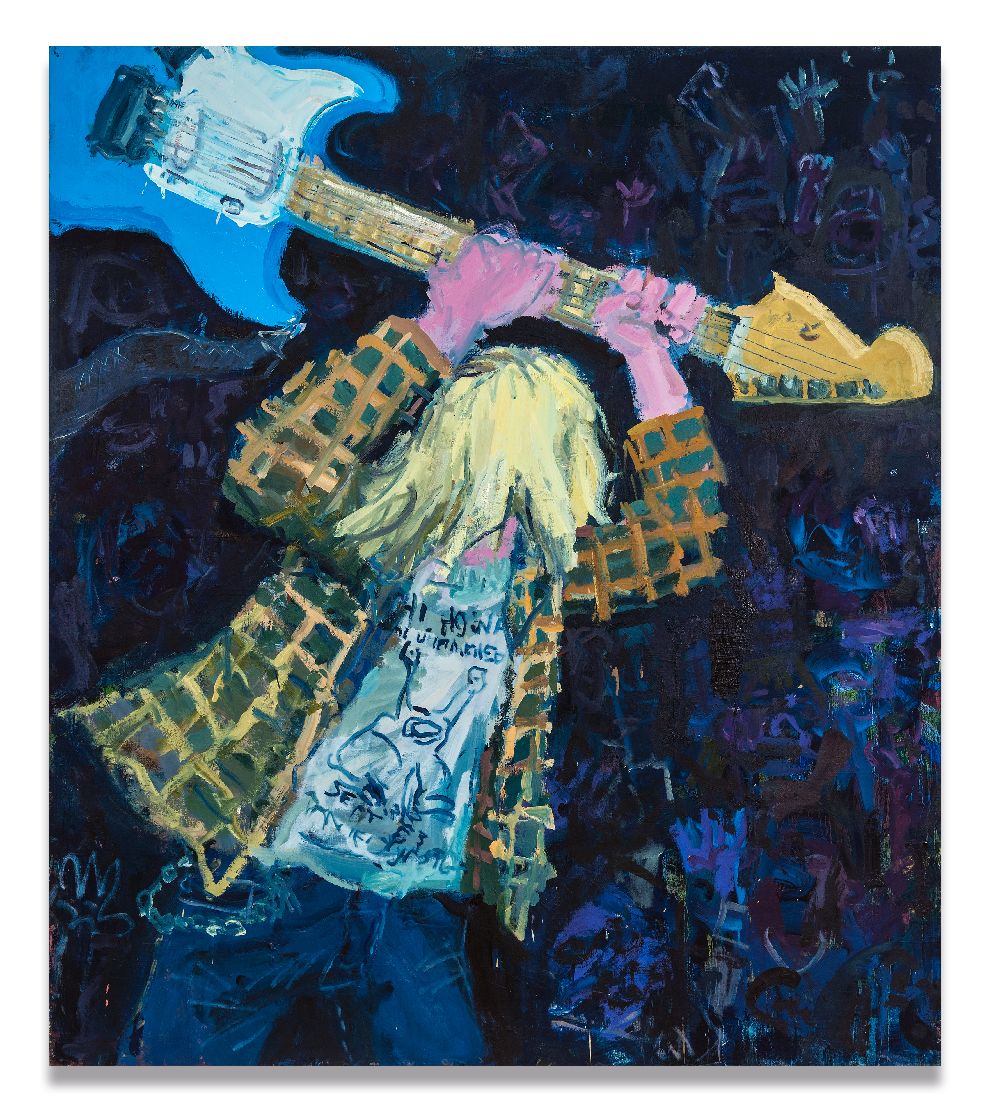 The whopping 66-by-58 inch oil-on-canvas painting is filled with inside-baseball details like a Daniel Johnston T-shirt and blue Fender guitar — but the tension and wild, tightly wound energy of Cobain’s posture is expressed with the simplest of brushstrokes. “It’s more important for me for the paintings to feel like something than to look like it,” says Bienvenu. “They have to be painted the way I paint — not the way a camera sees.”