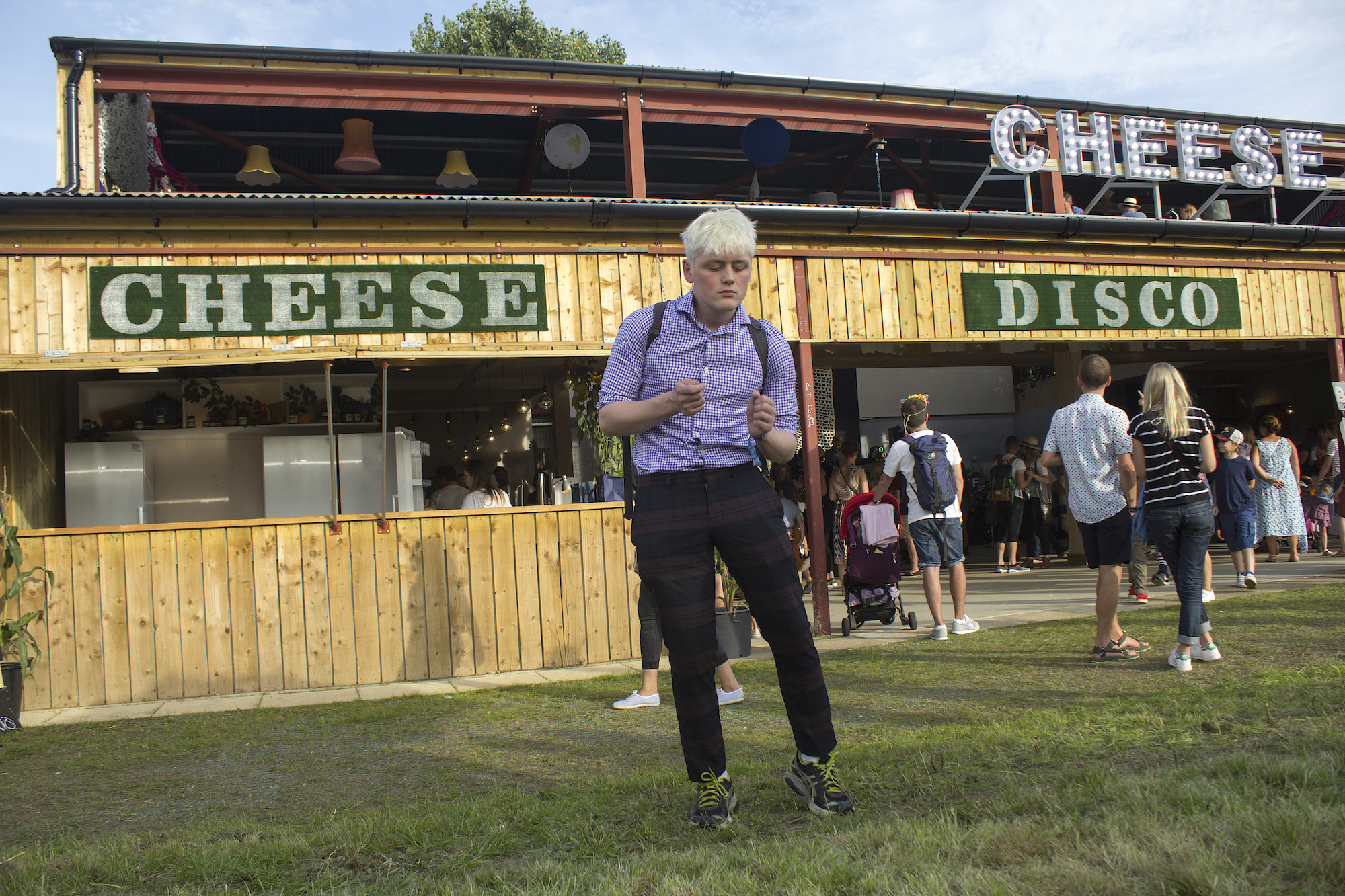 We’re twisting at corners like free-runners, darting around cones and popping down tight passageways, but he’s disappearing into the darkness. I come to a backstage bar I 100 percent shouldn’t be in, but he’s nowhere to be seen. I slump on a bale of hay out of breath and defeated. I’d been so stupid. Who was I to think that the Cheese Man himself or would be interested in me? What am I even doing here, surrounded by the richest people in the country? I am a man who literally arranges to go over to his friends’ houses to eat their cream crackers. I feel a tap on my shoulder.