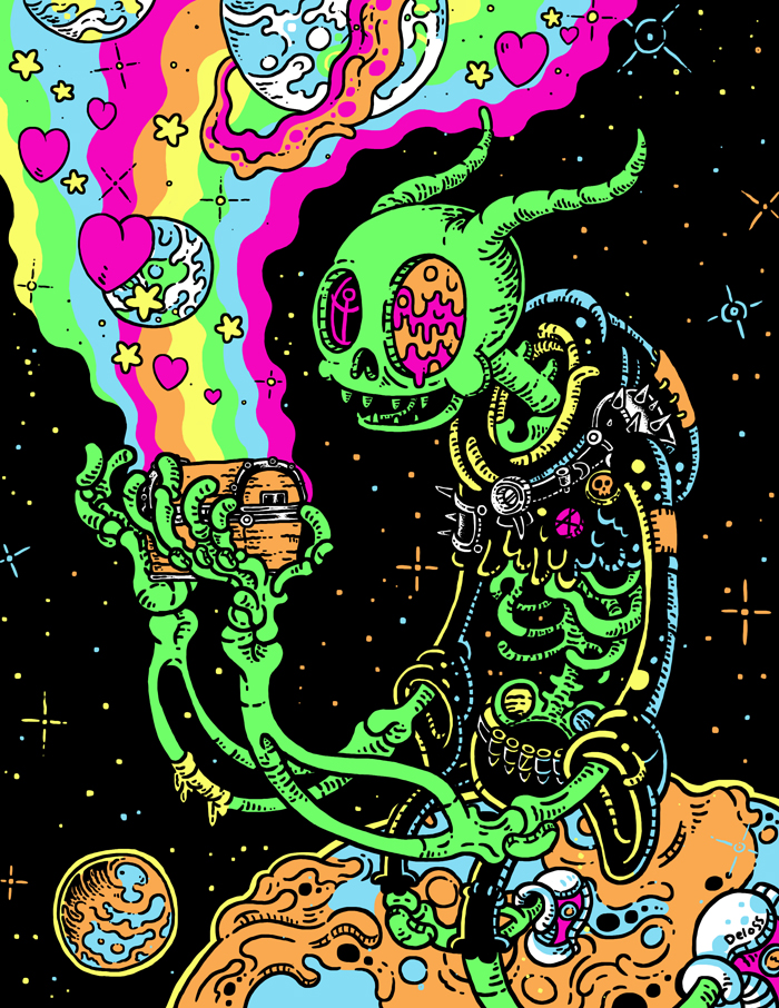 Could there be a note of discontent beneath all the throbbing neon ink? Even Gloombones himself can’t say for sure. “I prefer not to delve too deep into the characters I create,” he explains. “It defeats the purpose of my illustrations.” A video game artist by trade, he spends his days working with characters that follow story arcs. The Gloombones world is an escape. “My brain is so fleeting, and ideas are really hard to grasp, so painting little glimpses into larger potential storylines helps the viewer tell themselves the missing parts.”