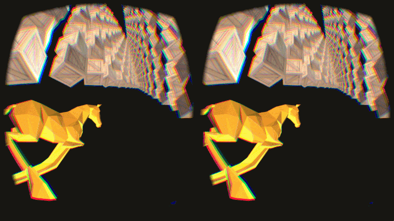 EleVr regularly make VR videos downloadable under a Creative Commons license, open source their code, and blog about their video experiments, camera setups, neuroscience, and mathematical results. So, head to their website to stay updated on their various projects, which includes Eifler’s Glitch Horse (see GIF below of the work-in-progress) and Pointland.