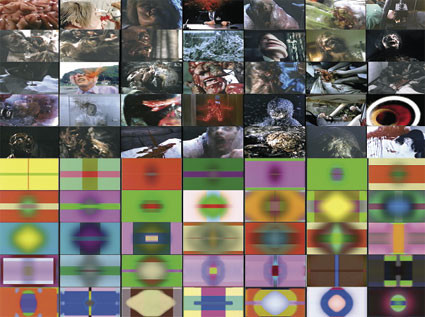 The collage ends with a scene from a Dario Argento film. A woman whose hands have been lopped off drags her arms across a wall, creating an intense arc of blood that cascades down. The scene repeats nearly 80 times, and your attention is drawn to different parts of the image, and to Ara’s eerie manipulation of the original soundtrack.