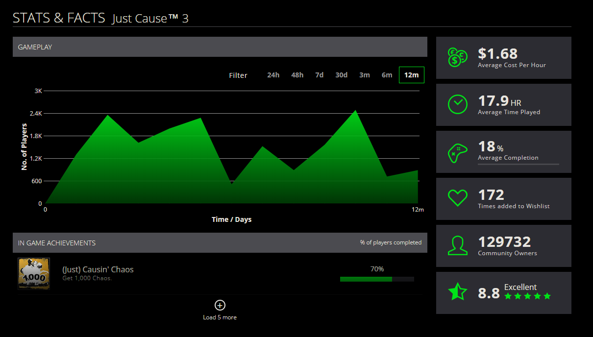 As first pointed out by video game publisher No More Robots founder Mike Rose on Twitter, GMG publishes assorted stats and facts about its games. The stats include how many GMG users have purchased the title, the average amount of time people played it, and the average cost for each hour of play. Just Cause 3 costs about $1.68 an hour. Pillars of Eternity clocks in at $2.02 an hour.
