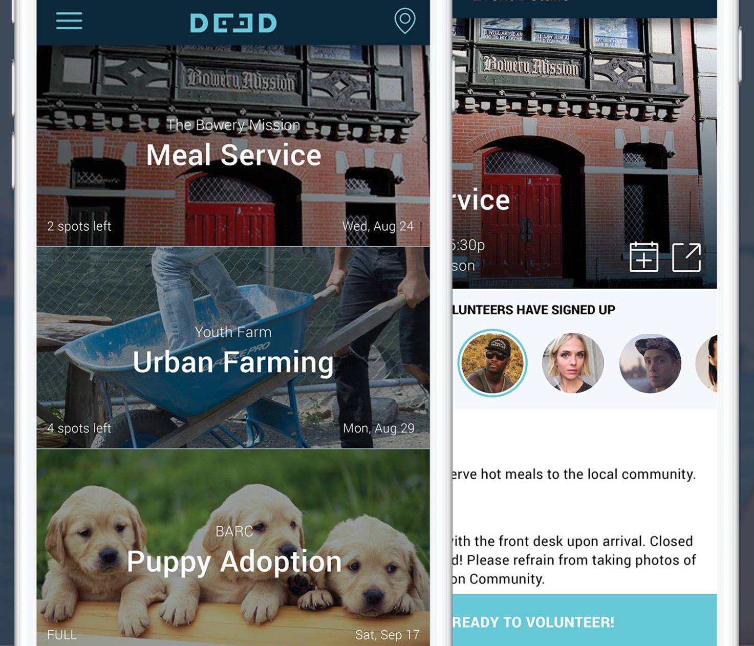 DEED is a New York based app that hooks up users with volunteering opportunities throughout the city, and streamlines the process into a few swipes and a tap.