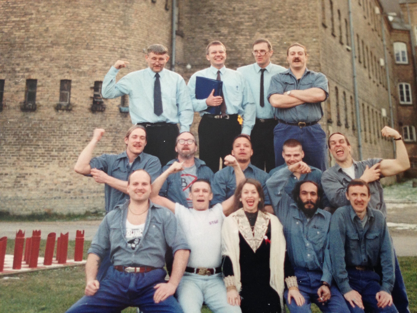 Lonne (øverst tv.) sammen med skuespillerinden Anne Marie Helger og Vridsløselilles teaterhold. Ved siden af Lonne står to medlemmer af Blekingegadebanden.
