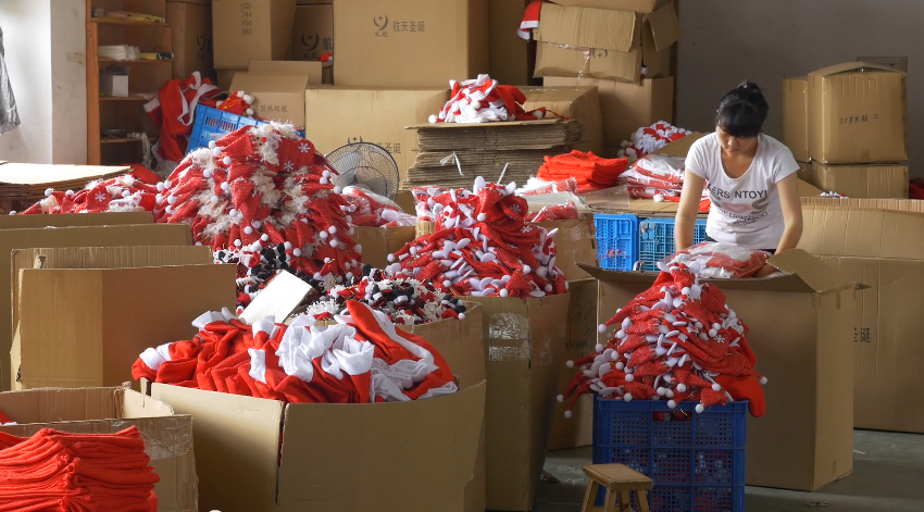 “Yiwu in China is not only home to the world’s largest wholesale commodity market but also many of the ‘Just in Time’ factories that produce seasonal or trending products,” Smith says in the Xmas Unwrapped video description, noting that the piece is “more of a jab at Western consumption than Chinese production” because “Christmas consumables are produced in summer ready for wholesale, packaging and shipping to principally Western markets.” Set to a cheery rendition of Jingle Bells sung by the Chinese Kids Choir and intercut with Chinese shopping centers and decoration stores, Smith’s documentation of the process contrasts sharply with the dingy factory floors that are decidedly not part of Santa’s factory.