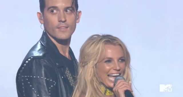 Britney’s back and she’s still wearing a spangly leotard last seen on a Vegas showgirl called Crystal. Or perhaps she borrowed and bedazzled Borat’s mankini. In any case we’re always rooting for Brit, in spite of the fact that her miming leaves a little (read a lot) to be desired. It’s been nearly a decade since she performed at the MTV VMAs—the last time was “Gimme More” back in 2007 and that was a very tough watch—so it feels like a lot was riding on this performance. Introed by Kim Kardashian West (whose right breast was threatening to escape for the entirety of the VMAs), Britney was joined by G-Eazy (whose crotch she lasciviously grabbed), for a rendition of “Make Me.” Was it a triumphant comeback? How many times has she come back at this point? Who cares really. Look how happy she is!