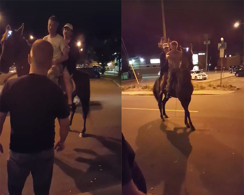 The video starts on a nighttime shot of a horse walking away, wearing what appear to be white sports socks and looking WASTED. I mean, this horse is all over the lane. In the background, we hear music and people yelling. It’s a night out! People are drinking and probably having some fun, and that runaway horse was probably heading home from the bar.