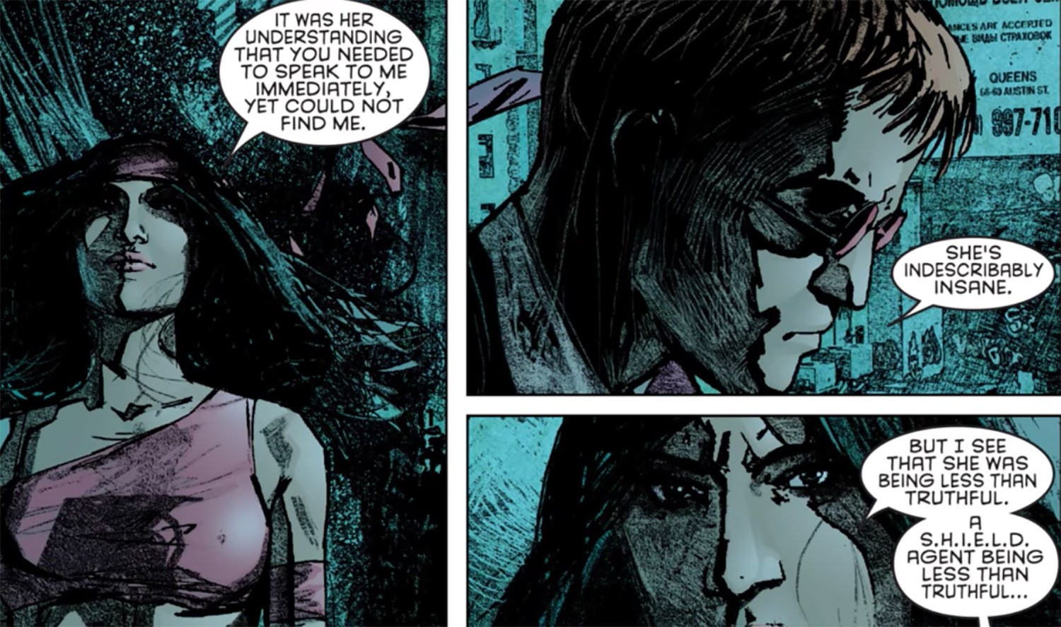 Daredevil and Elektra share a clandestine (though not uncommon), meeting on a rooftop, and even though neither party explicitly mentions it in their dialogue, Daredevil is feeling trapped and constrained by recent events. Without a word, the reader gets a sense of this unspoken tension thanks solely to the artwork, the setting, the panel blocking, the color, and the placement of word balloons.